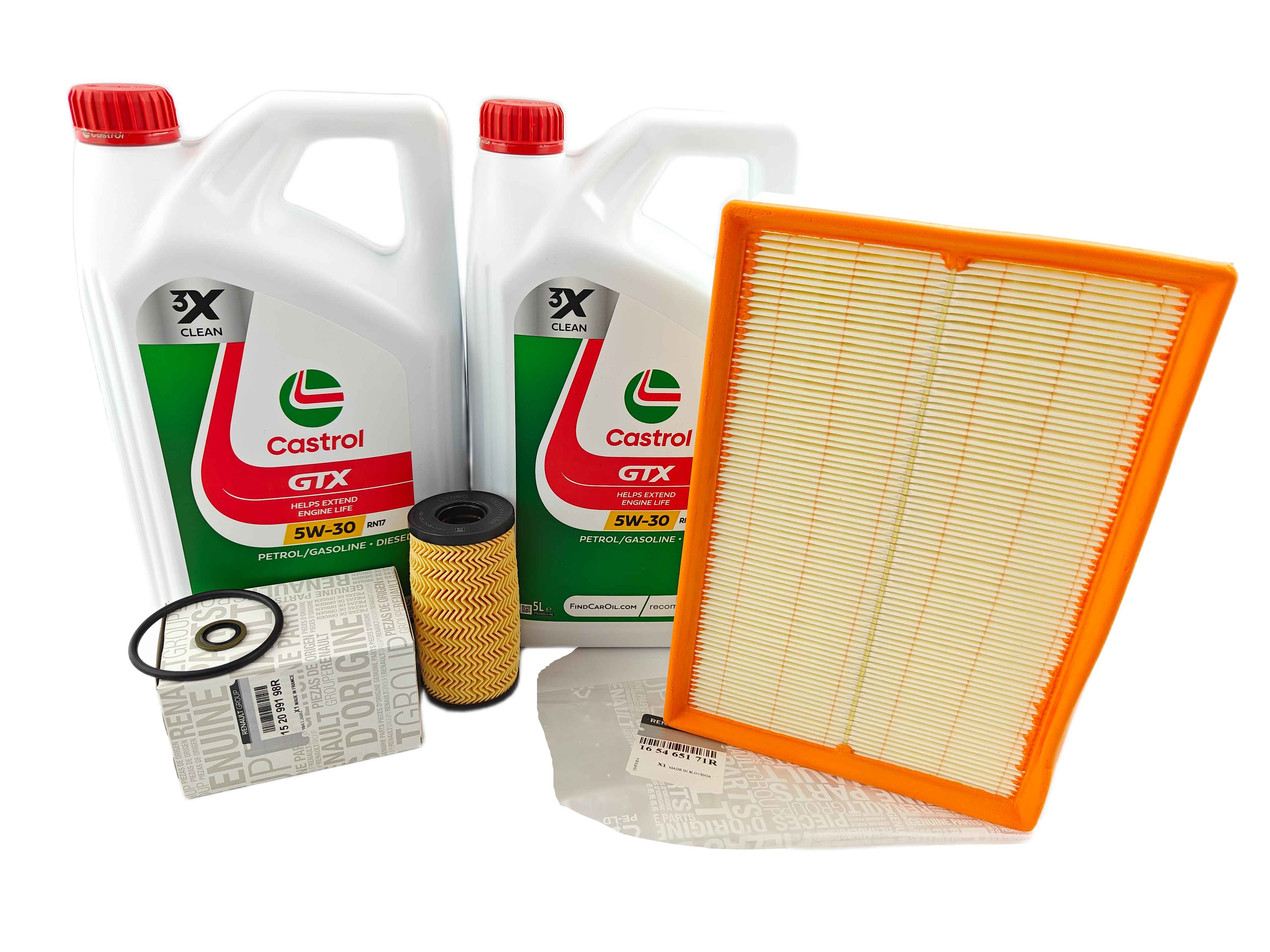 Oryginalny zestaw filtra oleju, powietrza, podkładki + Olej CASTROL GTX 5W30 RN17 5L+ 5L do samochodu RENAULT MASTER IV 2.0 BLUE DCI